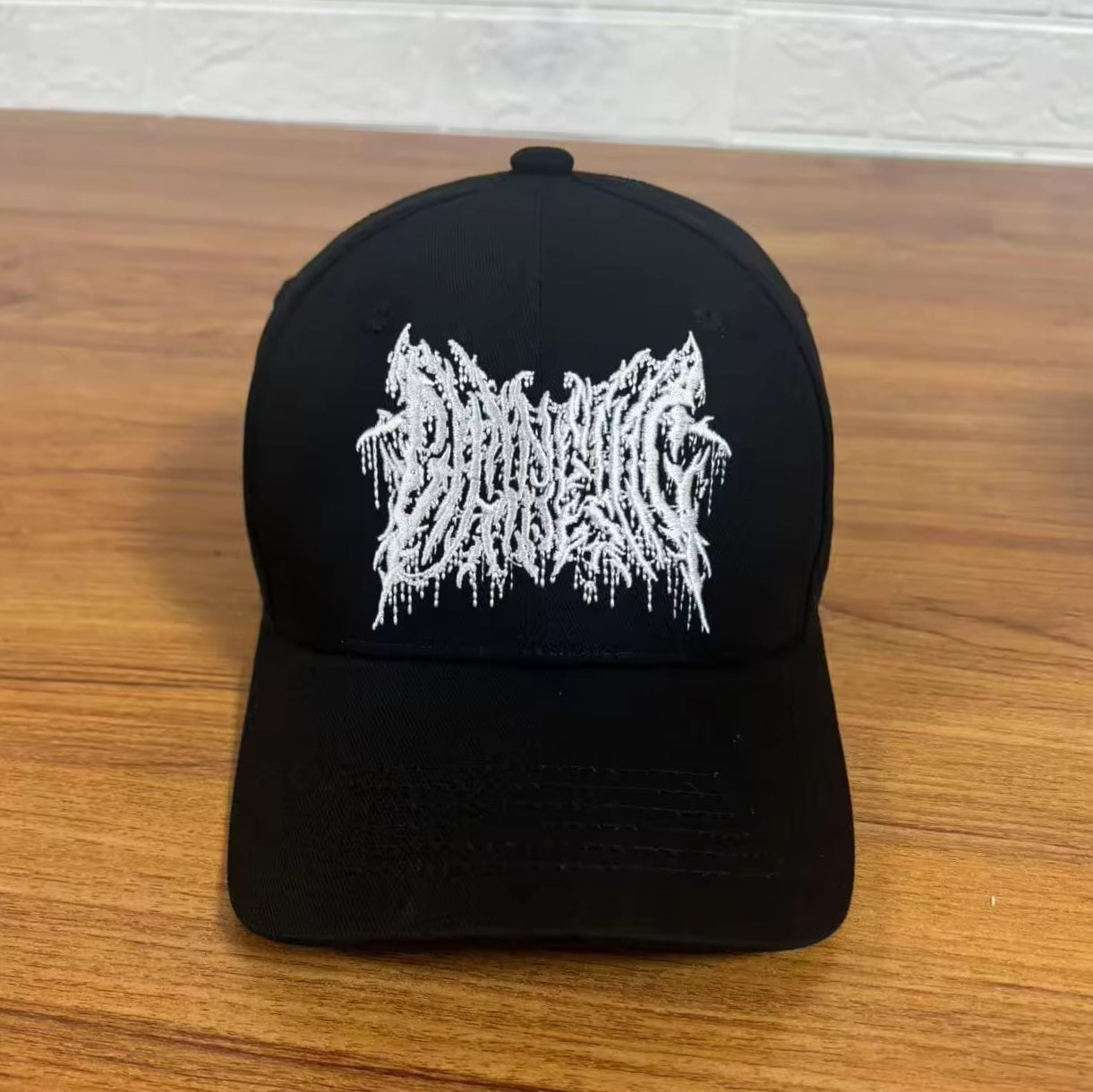 A black cap with white embroidery.